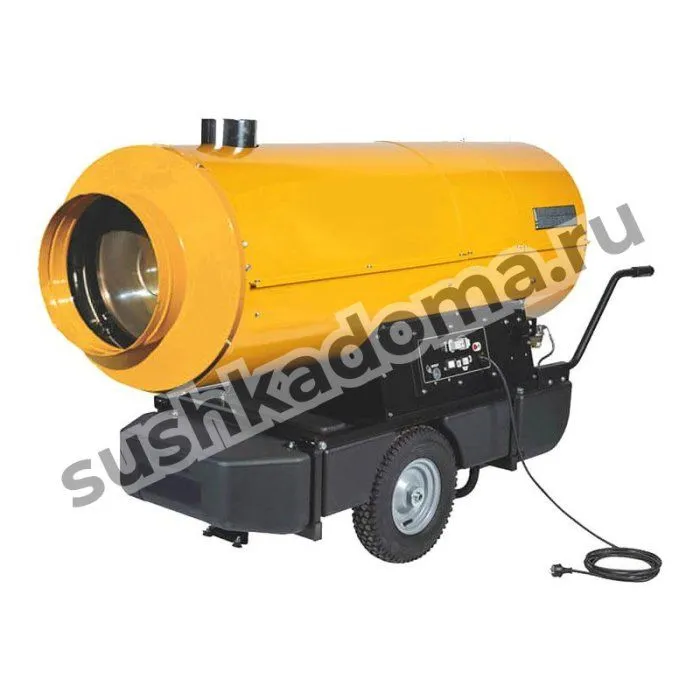 Эта тепловая пушка работает на дизельном топливе. Ее корпус оснащен двумя прочными колесами и ее несложно транспортировать. Воздух нагнетается мощным вентилятором. Имеется возможность подключения аналогового или электронного термостата. Данная тепловая пушка считается универсальной и идеально подходит для строительных объектов, для размораживания траншей, разогрева помещений любого назначения и т.д.